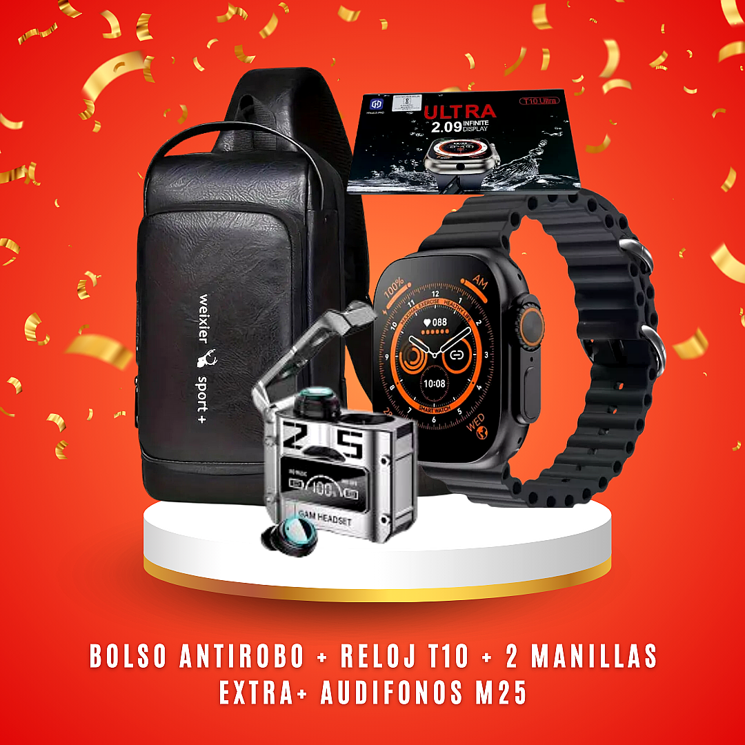 COMBO NAVIDEÑO🎁🎄: "Todo en uno: Reloj inteligente Ultra (4Manillas), Bolso Antirrobo y Audifonos M10 de Regalo.